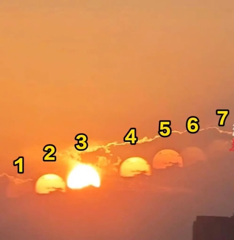 Específicamente, en las imágenes se pueden observar 7 soles que aparecen en medio del atardecer, uno al lado del otro, entre las nubes.