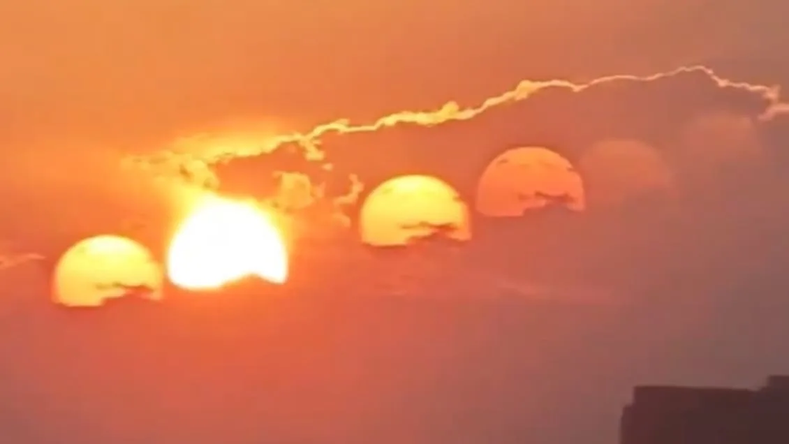 Específicamente, en las imágenes se pueden observar 7 soles que aparecen en medio del atardecer, uno al lado del otro, entre las nubes.